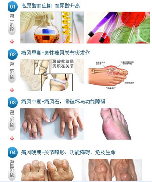 按照痛风的自然病程可分为急性期、间歇期、慢性期。急性痛风性关节炎发病前没有任何先兆。轻度外伤,暴食高嘌呤食物或过度饮酒,手术,疲劳,情绪紧张,内科急症(如感染,血管阻塞)均可诱发痛风急性发作。常在夜间发作的急性单关节或多关节疼痛通常是首发症状。疼痛进行性加重,呈剧痛。体征类似于急性感染,有肿胀,局部发热,红及明显触痛等。局部皮肤紧张,发热,有光泽,外观呈暗红色或紫红色。大趾的跖趾关节累及最常见(足痛风),足弓,踝关节,膝关节,腕关节和肘关节等也是常见发病部位。全身表现包括发热,心悸,寒战,不适及白细胞增多。