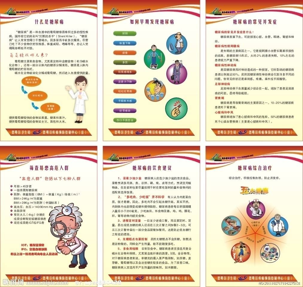 (一)宣传教育 由于约有半数以上的早期患者并无症状或症状轻微,常不能及时确诊和得到防治,因而要大力开展糖尿病宣传教育,让已确诊的患者了解糖尿病并逐渐熟悉饮食,运动,用药和尿糖、血糖监测等基本措施的综合治疗原则,配合医务人员提高控制质量;让>50岁的对象,尤其是前述高危对象,每年做一次餐后2小时的血糖筛选检查,使无症状的患者尽多尽早得到确诊和防治。