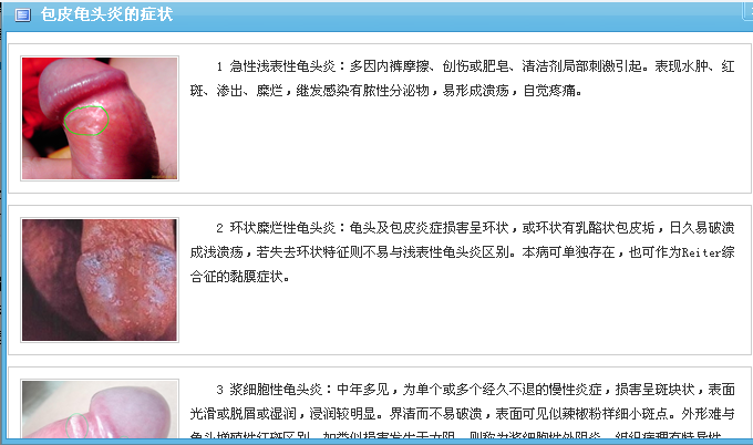 了解包皮龟头炎,首先要从了解其症状开始,龟头包皮炎在早期龟头和包皮的表面会有水肿,充血的现象,尿道口周围发红并出现创面、糜烂,并可发展成浅表的溃疡,有脓性分泌物流出,病人自觉阴茎头处发痒或有灼热感,随后疼痛。溃烂后可流脓、味臭。严重者还会有乏力、低热、腹股沟淋巴结肿大及压痛。在出现这些症状后要及早到医院进行诊断治疗,避免病情扩大。