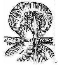 2. 腹内压力增高,如慢性咳嗽、便秘、排尿困难、婴儿经常啼哭、举重、呕吐等使腹内压增高将腹腔脏器经腹壁薄弱处挤出一个小口袋状称疝囊。绝大部分脏器可以回入腹腔称可复性疝,有的则须轻揉才能回复。有的腹壁缺口较小,而用力挤出的腹腔脏器不能回复称嵌顿疝;有的压迫了血管,仅突出的脏器缺血称为绞窄性疝。绞窄性疝能造成突出的脏器环死。突出物如是肠管则可造成肠梗阻、肠坏死、穿孔、腹膜炎等。也可从腹壁穿破形成粪瘘。疝形成后,随着脏器反复突出则疝囊逐渐扩大